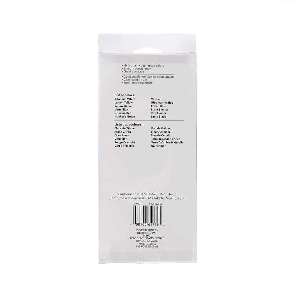 This high-quality acrylic paint set offers great coverage and smooth consistency. Perfect for any artist, the collection is versatile, durable, and offers lightfast pigment. This set features the following colors: Titanium White, Lemon Yellow, Yellow Ochre, Vermilion, Crimson Red, Hooker’s Green, Viridian, Ultramarine Blue, Cobalt Blue, Burnt Sienna, Raw Umber, and Lamp Black.