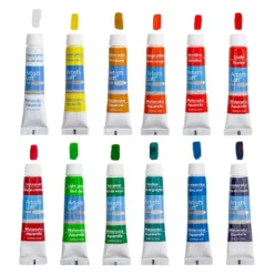 These lovely watercolor paints will come in handy for a wide range of creative projects. You can use these paints with brushes of all sizes to put your imagination on paper. Pack colors include Chinese White, Lemon Yellow, Yellow Ochre, Orange Yellow, Vermillion, Crimson Red, Scarlet, Light Green, Sap Green, Viridian, Cerulean Blue, Prussian Blue, Ultramarine Blue, Violet, Burnt Sienna, Burnt Umber, Lamp Black, Gold, Silver, Copper, Metallic White, Metallic Purple, Metallic Blue, and Metallic Black.