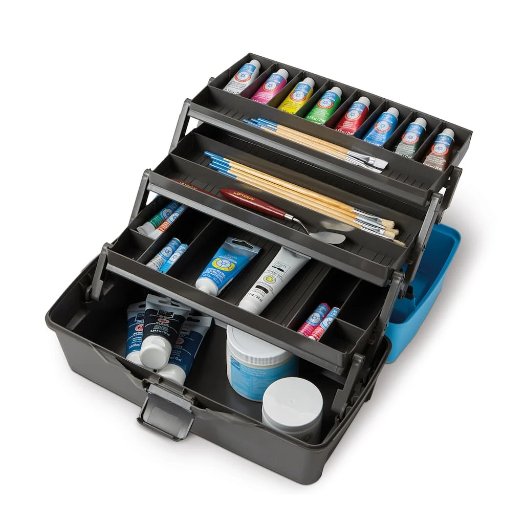 Keep your paints, brushes and other art supplies organized, using this storage box. It has removable dividers for customizing the storage space. Its three trays prevent spills and collapse down for easy storage. With the draw-tight latch and tongue-and-groove design, this box is durable and efficient.