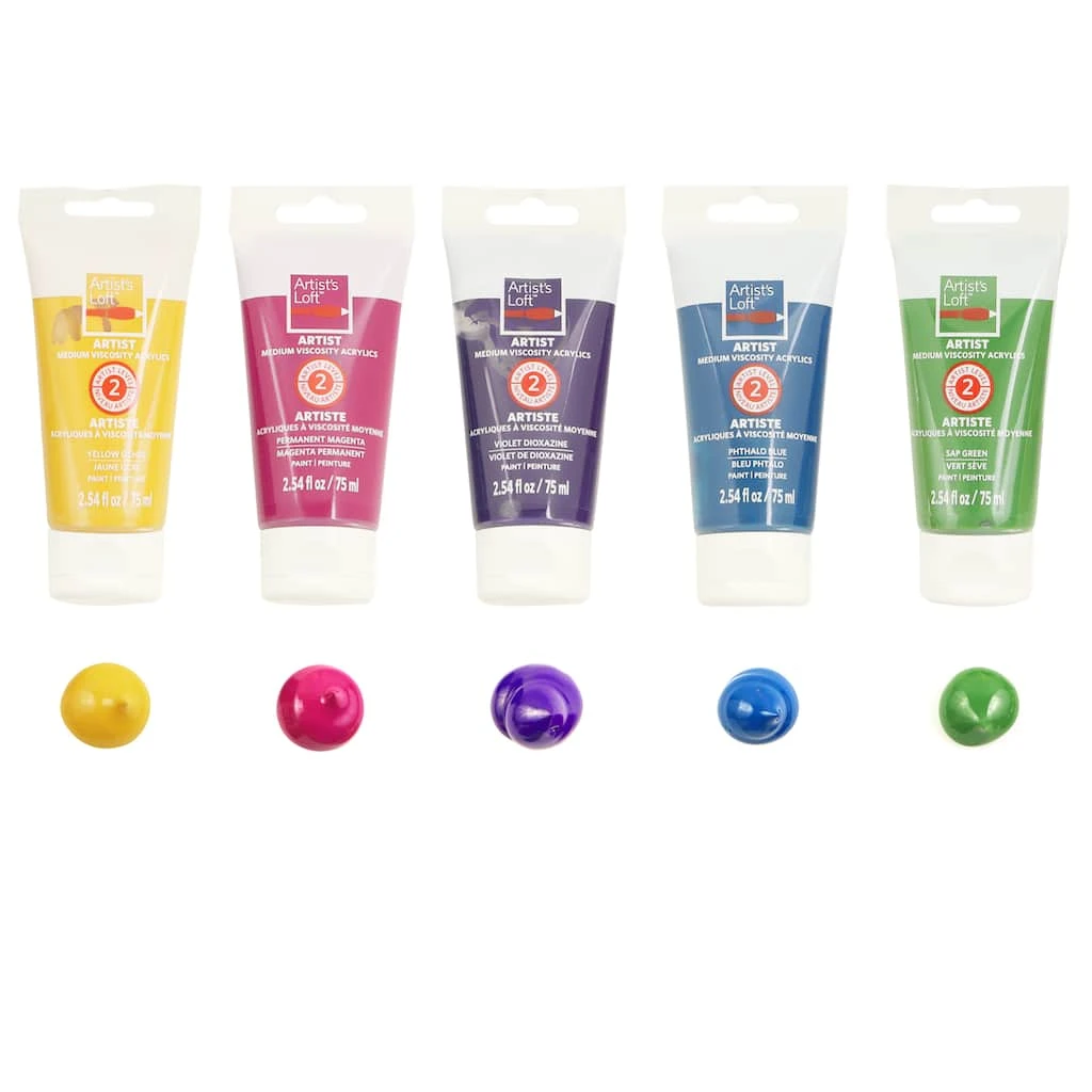 Bring your creative projects to life with this acrylic paint. The paint colors of this pack include: Yellow Ochre, Permanent Magenta, Violet Dioxazine, Phthalo Blue, and Sap Green.