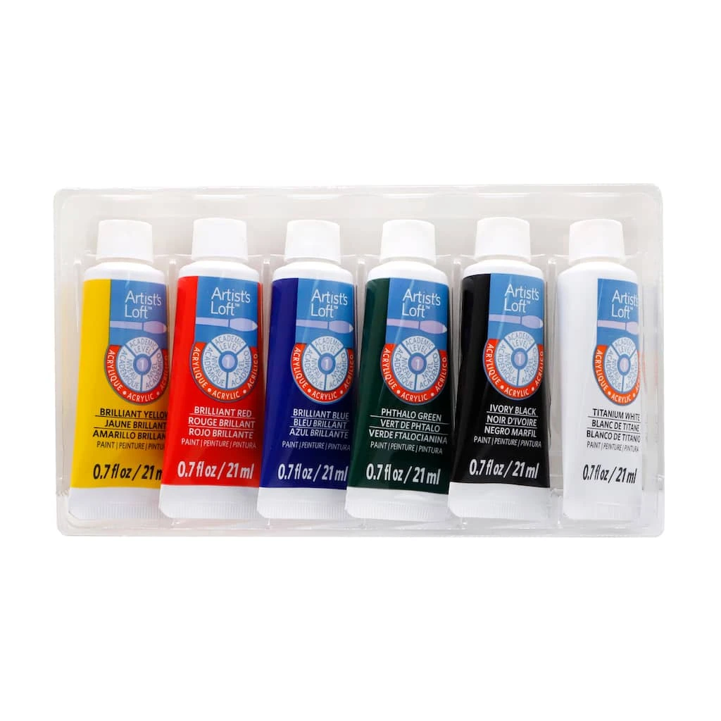 This primary acrylic paint set is perfect for a variety of painting projects. It features brilliant primary hues that are guaranteed to bring your artwork to life. Paint colors include: Brilliant Yellow, Brilliant Red, Brilliant Blue, Phthalo Green, Ivory Black, and Titanium White.