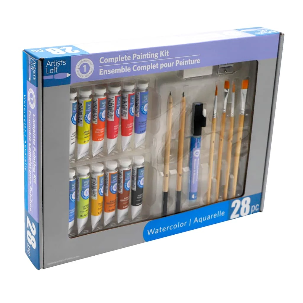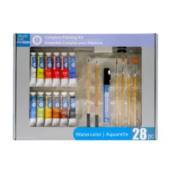 This complete watercolor painting set is perfect for your art projects. From paint tubes and brushes to pencils, paper sheets and more, this kit has everything you need to begin drawing and painting. Paint colors include Cobalt Blue Hue, Sap Green, Yellow Ochre, Burnt Umber, Ivory Black, China White, Lemon Yellow, Primary Red Cadmium Hue, Permanent Pink, Alizarin Crimson, and Ultramarine Blue.