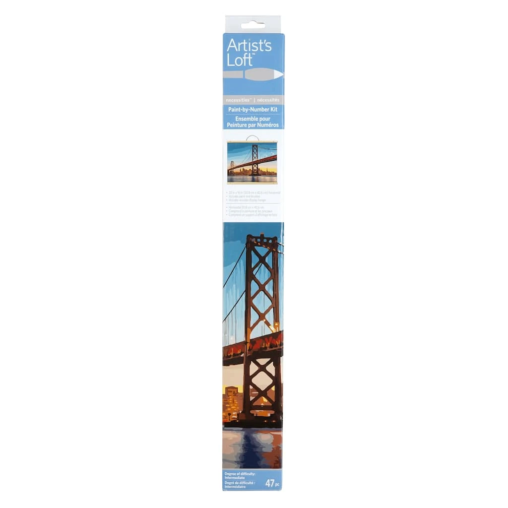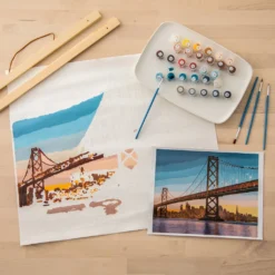 This Bay Bridge scenery paint-by-number kit is a fun, simple, and relaxing activity for teens, adults, and seniors! There is no previous experience with art or painting needed. Simply match the numbered paint pots with the numbered sections. Secure the completed painting on the included wooden display hanger, and mount it on your living room wall for all to see.